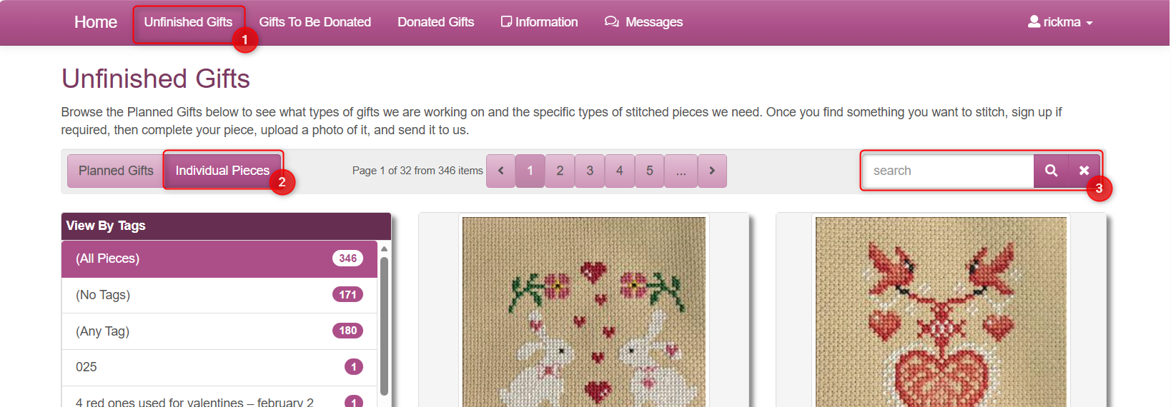 Our site has three main sections — Unfinished Gifts, Gifts To Be Donated, and Donated Gifts — which members use throughout the process of creating and donating finished pieces. Each section is described in more detail below.