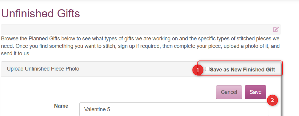 Sometimes a stitcher sends in a piece they have already finished themselves, such as a bookmark. In these cases, it is fine to create only a Finished Gift using the New Finished Gift button on the Gifts To Be Donated page. There is no need to link to an unfinished gift.