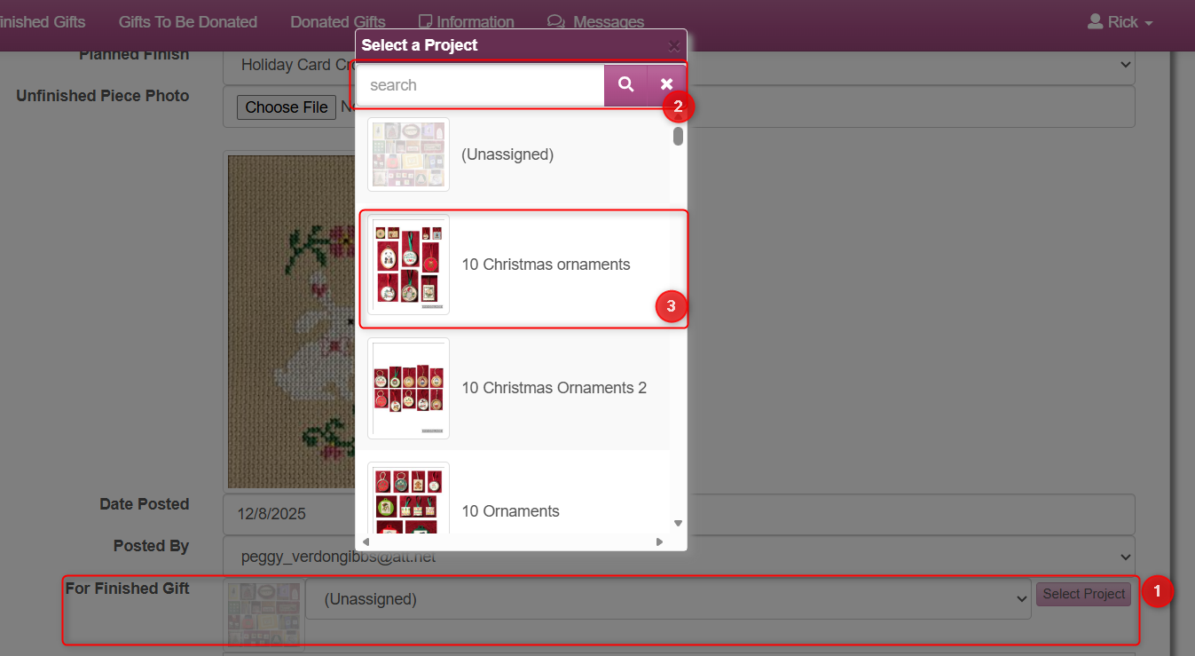 - Edit the unfinished piece and click the Select Project button under the For Finished Gift row. A pop-up window will appear showing the Gifts To Be Donated. Search or scroll to find the correct gift, then click it to select.