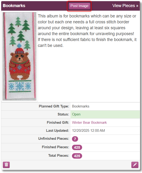 Once your piece is complete, use the Post Image button in the category that best matches your stitched piece. Fill out as much information as possible. Use a descriptive name to help finishers locate the piece later — many pieces look similar, so specificity is important. You may ignore the Tags field; it is used internally by admins and finishers. Including the pattern name and designer helps us track the piece and provides information we can use on Facebook if it is featured.