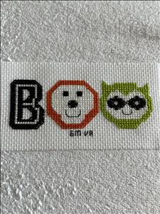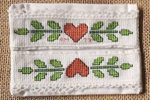 For soft book use only: 6.5” x 6.5” squares of white, cream or off white Aida with a motif centered on them. Each piece should be no bigger than 3 1/2” x 3 1/2” or 49 stitches by 49 stitches if 14 ct.